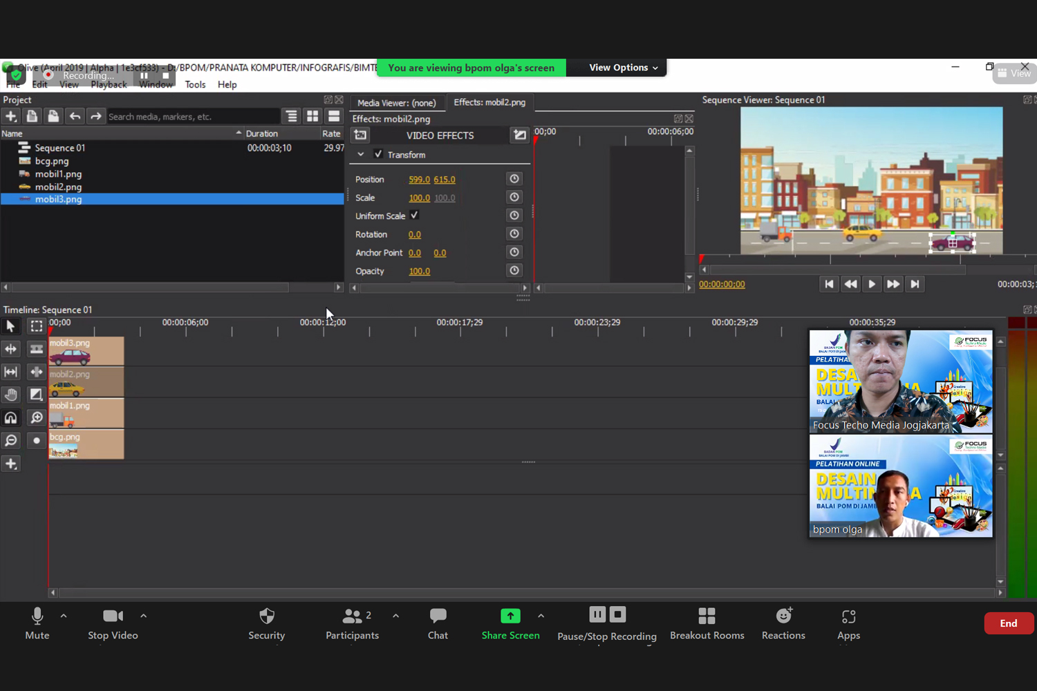 Jum’at (31/12) Focus Techno Media (FTM) Yogyakarta menyelenggarakan pelatihan online editing video menggunakan Olive. Pelatihan ini diikuti oleh peserta dari Balai Pengawas Obat dan Makanan (Balai POM) Jambi.