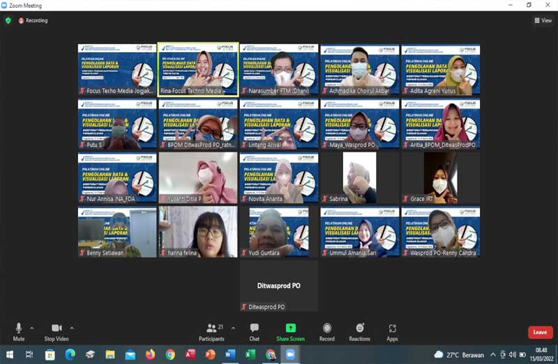Pelatihan dilaksanakan secara virtual (online) selama 2 hari, dari tanggal 14 Maret s.d. 15 Maret 2022, diikuti oleh 20 orang peserta yang berasal dari pegawai dan staf di lingkungan kantor Direktorat Pengawasan Produksi Pangan Olahan, BPOM Republik Indonesia. Latar belakang dari pelatihan ini, adalah semakin berkembangnya perumusan kebijakan berbasis data, maka diperlukan penguatan kapasitas Sumber Daya Manusia (SDM) terkait dengan pengolahan data.